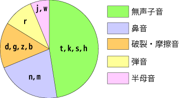 子音は空気の流れを色々に妨げることで発声され、b,p,m.n.t.d.k.gはそれぞれ、舌の先、 舌の後ろで一時空気の流れを留めて急に吐き出すときに出る音で、閉鎖音または破裂音といいます。z,sなどは 空気の流れに狭い隙間を作ることで生じる摩擦音です。