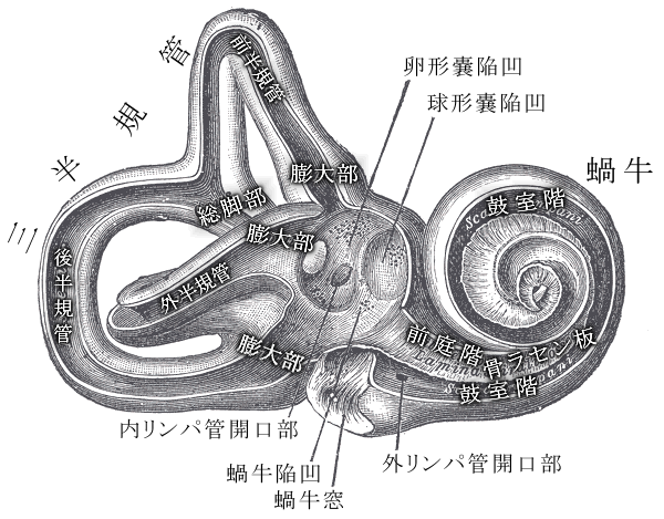 内耳は連続したひとつの空洞ですが、前方から蝸牛、前庭および三半規管の三部分があり、この内蝸牛が聞こえに関与し、前庭および三半規管が平衡感覚に関与しています。