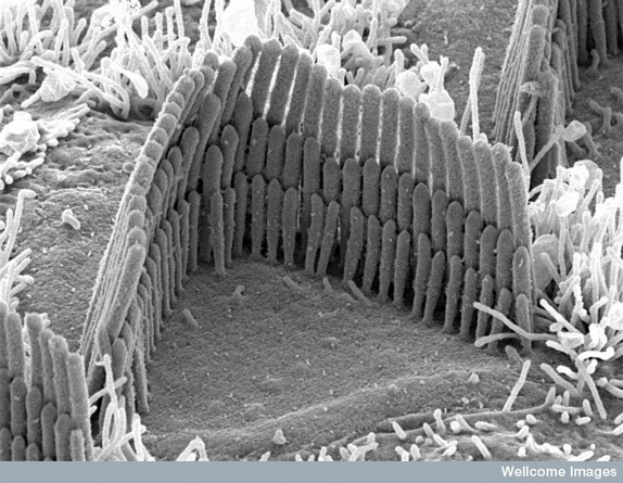 ![]() <外有毛細胞>電子顕微鏡写真 |