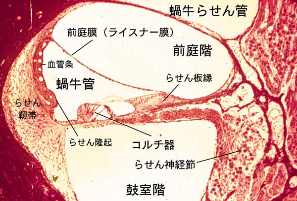 それぞれの階はリンパ液で満たされており、基底膜によって上部の前庭階と下部の鼓室階に分かれ、 前庭階にはライスネル膜があって蝸牛管が作られている。蝸牛管には基底膜の上にラセン器(コルチ器)が載っており、蓋膜がその上を覆っている。