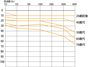 難聴の原因で最も多いのは加齢による難聴です。70歳以上の方の平均聴力は40デシベル以上であり、日常生活に 支障がでるレベルとなっています。