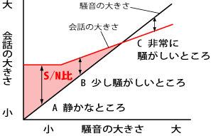 会話と雑音の比率をS/N比(スピーチ/ノイズ比)と言い、難聴の方はこの比率が大きくないと聞き分けるのが難しくなります。